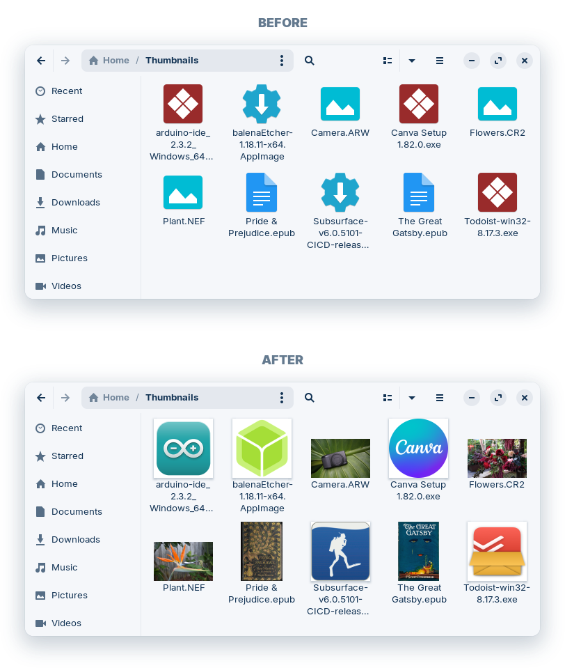 অনেকসময় তুলনামূলক ছোটখাট কিছু ব্যাপার এক্সপ্রেরিয়েন্সে একটা পার্থক্য গড়ে দেয়। সেরকম একটি ইম্প্রুভমেন্ট হলো এখন ফাইল ম্যানেজার .exe ইন্সটলার, .AppImage অ্যাপস, RAW ইমেজ ও .epub ইবুকস এর থাম্বনেইল প্রদর্শন করবে।